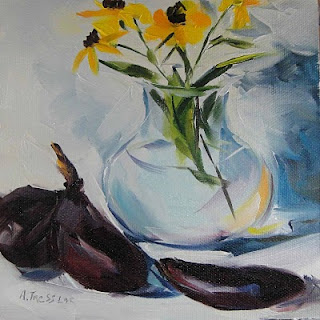 I thought about calling this painting "The Argument". It looks like they are so angry they don't even want to look at each other. No, I didn't just have a dispute with my husband. No personal issues here, just difficulty coming up with titles at the end of a long day of painting. This is the last of the eggplants for now. On to my next victims.